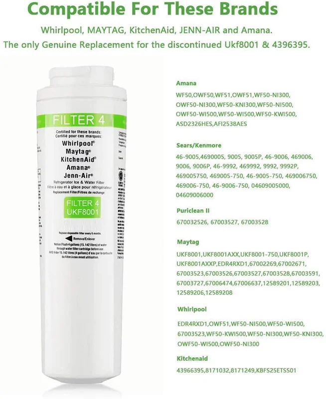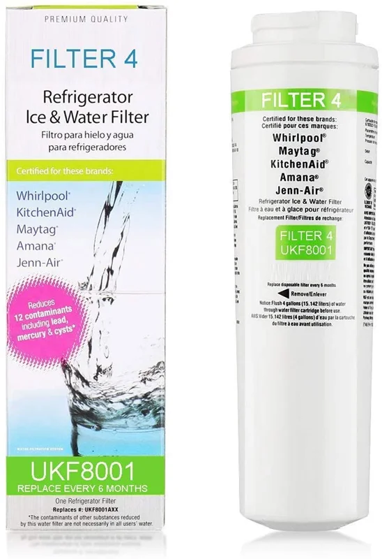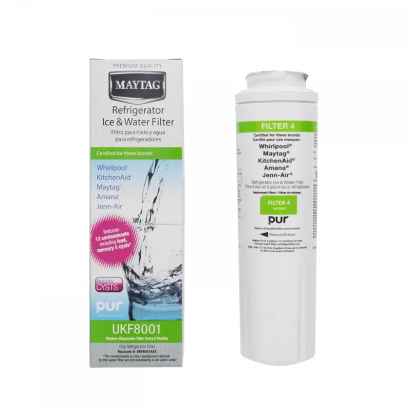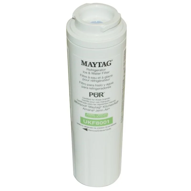فیلتر تصفیه آب یخچال مایتگ مدل موشکی یا UKF8001 سازگار با یخچال MAYTAG.کیست ها ، آزبست ، ذرات معلق ، سرب ، جیوه را کاهش می دهدضمن کاهش طعم و بوی کلر ، فلوراید مفید را در آب حفظ می کندبرای استفاده در یخچالهای maytag و Jenn-air. هر 6 ماه تعویض کنید.فیلتر آب یخچال مجاز NSF.اصلی